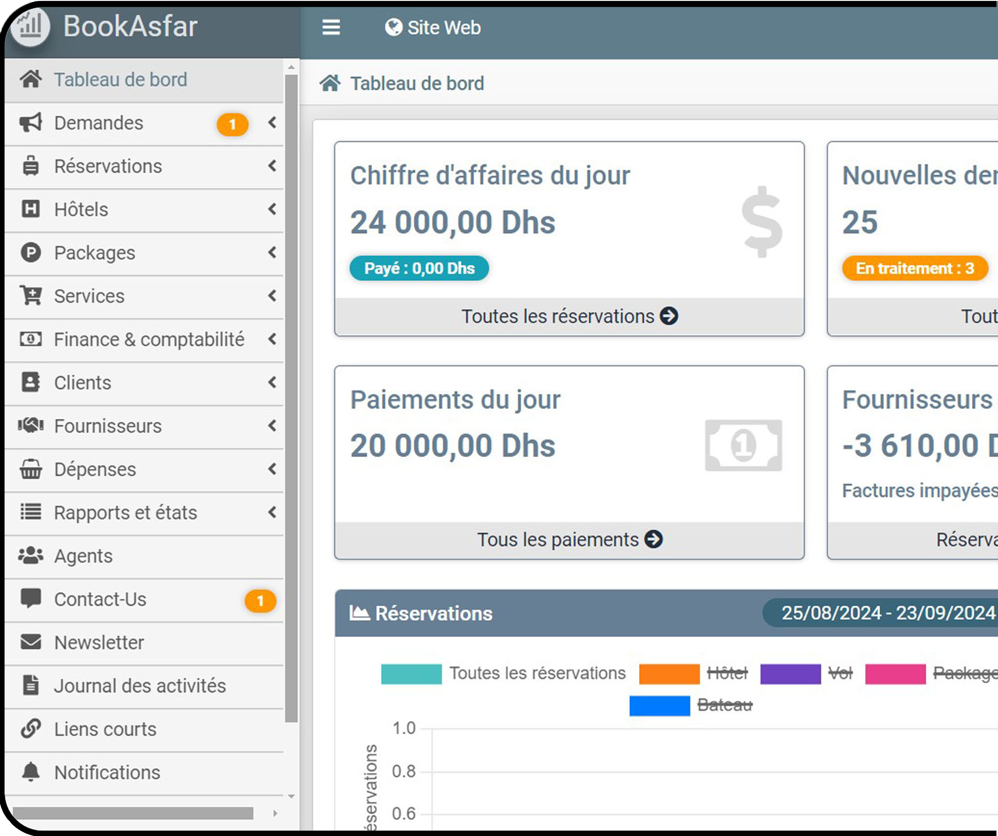 Avec BOOKASFAR, gérez facilement vos finances, factures, et paiements. Suivez vos revenus, dépenses, et optimisez votre comptabilité grâce à des rapports détaillés et en temps réel, tout en automatisant les tâches administratives pour garantir une gestion financière fluide de votre agence de voyage.
